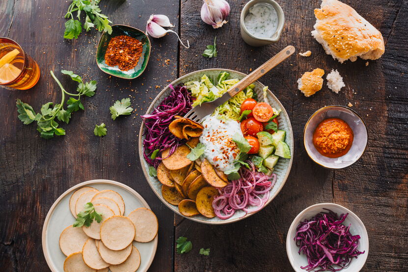 1. Für die Knoblauchsauce den veganen Joghurt mit fein geriebenem Knoblauch, Zitronenabrieb und -saft